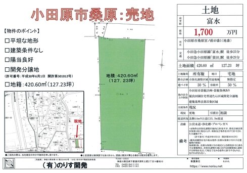 小田原市の優良田園住宅型連たん区域開発分譲地です。420.60u(127.23坪)の広さを生かしてマイホームを建築してください。お庭、ガーデニング、駐車場スペース、ドックランと夢は広がります!